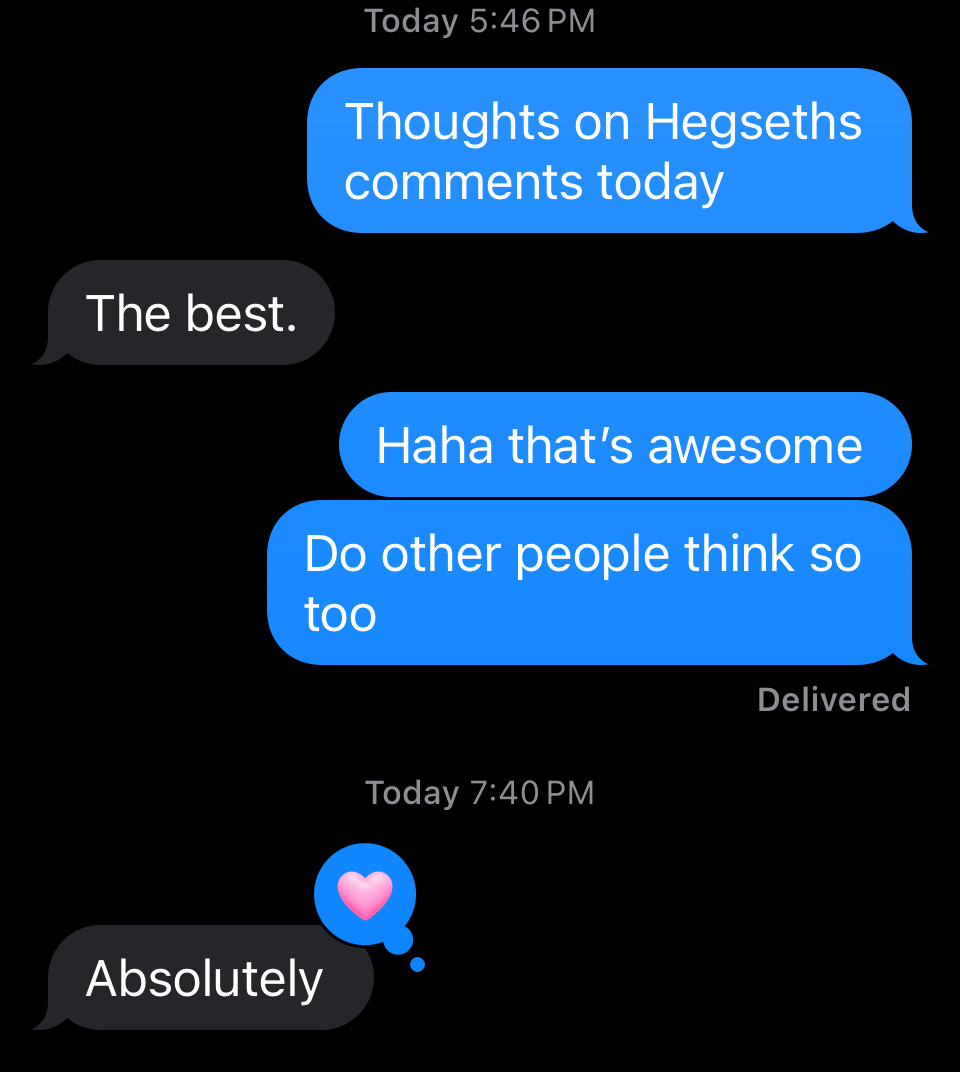 Secretary of War Pete Hegseth gathered the top-ranking military officials and basically said: fewer drag shows, more pull-ups. I texted a high-ranking military friend to ask what he thought about Secretary Hegseth’s remarks: