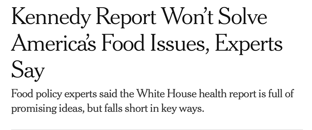 The experts say RFK Jr.’s MAHA agenda for healthier food isn’t going to work, thanks to the great reporting from The New York Times. I for one am so grateful we have the experts to help us navigate what’s true in the food lane. They’ve done such a stellar job over the past 60 years solving the obesity and metabolic disease crisis. Where would we be without them? Trust the process. Trust the experts.